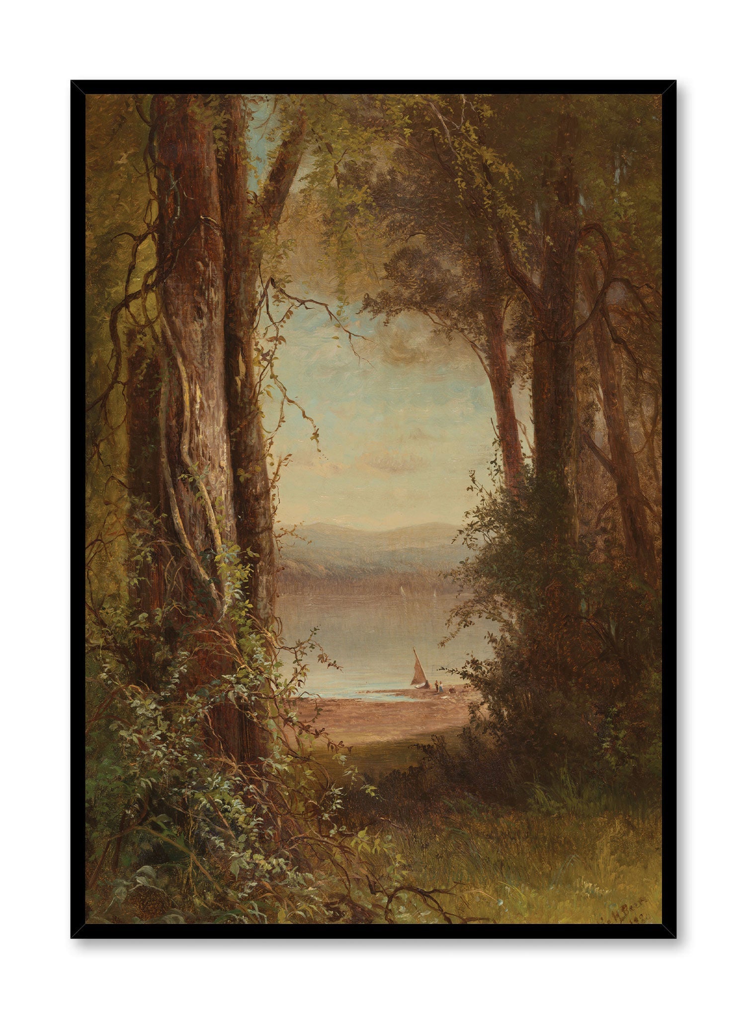 This serene painting captures a picturesque lakeside scene, framed by towering trees that arch gracefully toward the water. The tranquil lake stretches into the distance, with soft mountains hazily visible on the horizon.