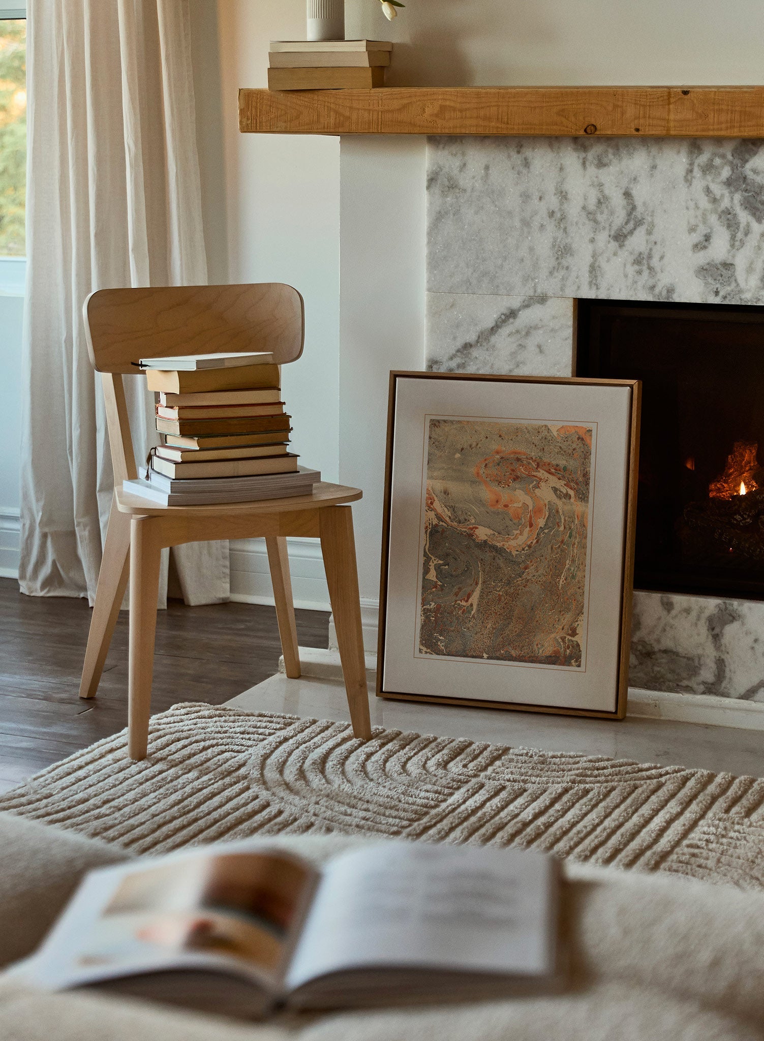 This captivating marbled print brings to life the fiery hues of a sunset sky, with streaks of amber, coral, and charcoal intertwining in a dramatic yet elegant dance. The textured surface adds a tactile depth, reminiscent of vintage bookbinding marbled paper.