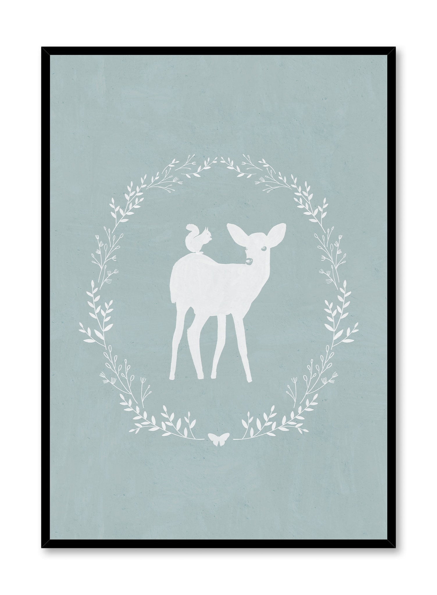 A gentle deer and squirrel silhouette stand within an intricate wreath of flora, set against a soft blue-gray backdrop. This piece radiates charm and nostalgia, evoking the innocence of classic storybook illustrations.